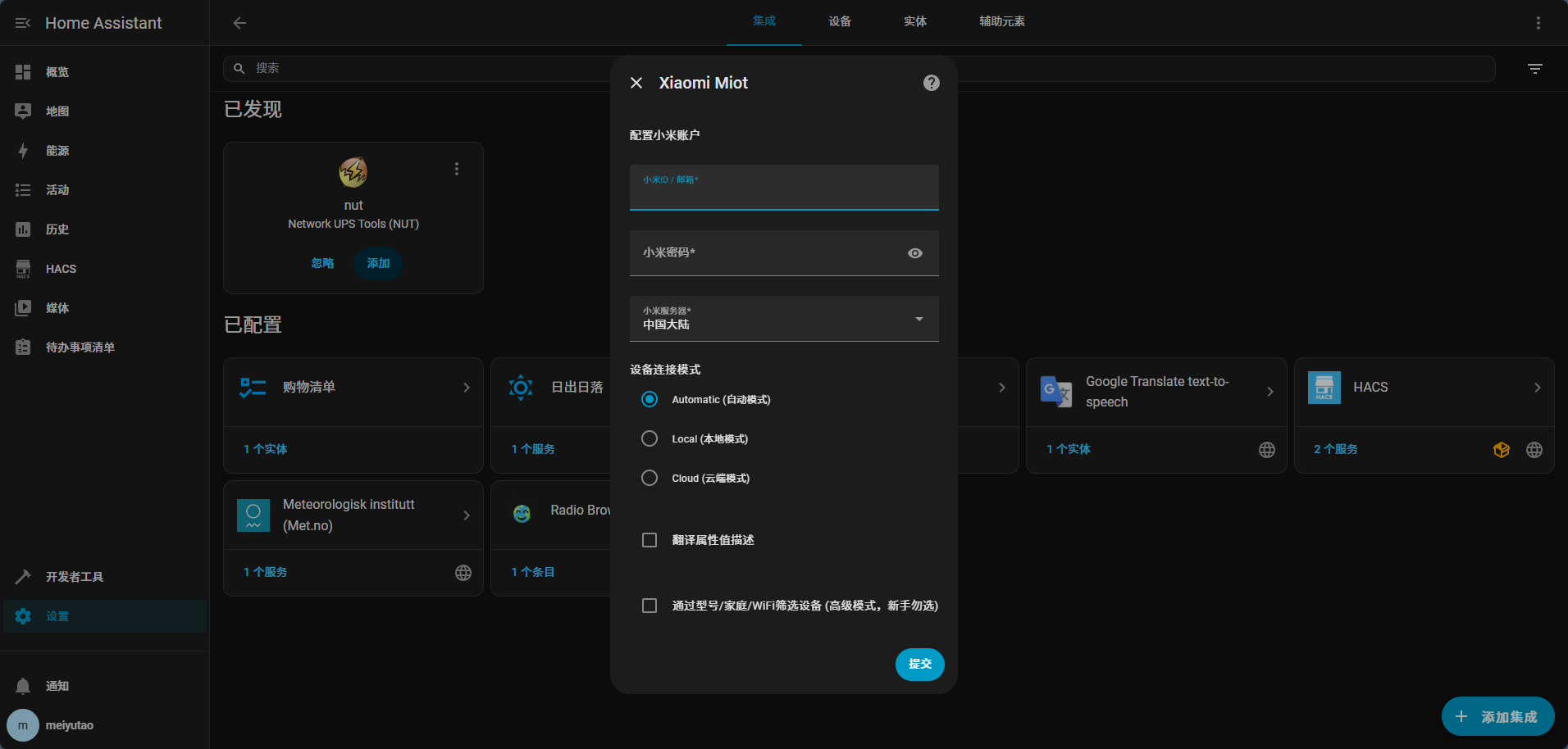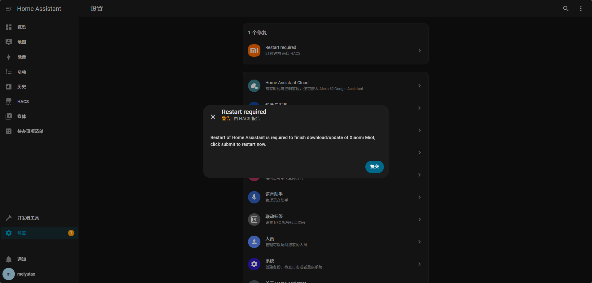 设置 —> Xiaomi Miot 提交后会自动重启 HA 容器