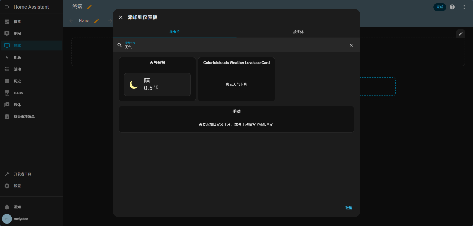 添加完成后,在卡片中搜索“天气”,找到"Colorfulclouds Weather Card"后开始配置