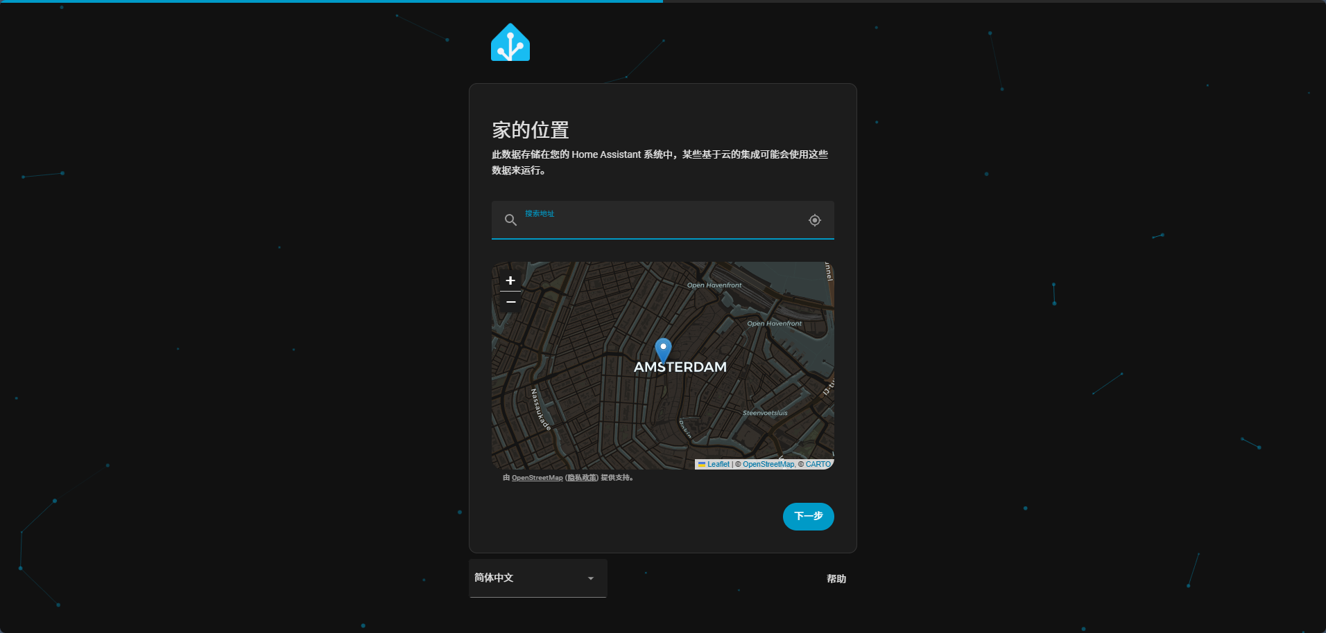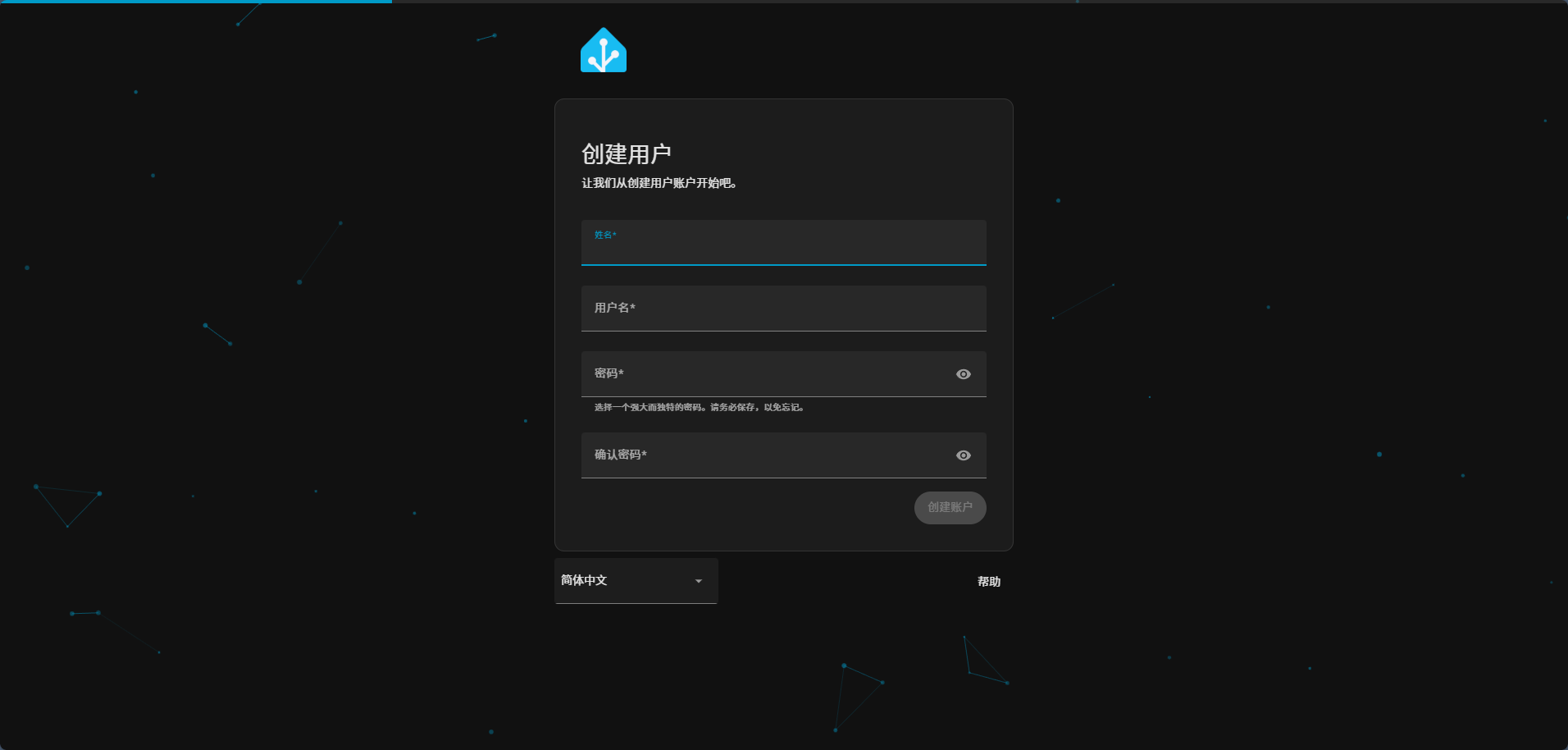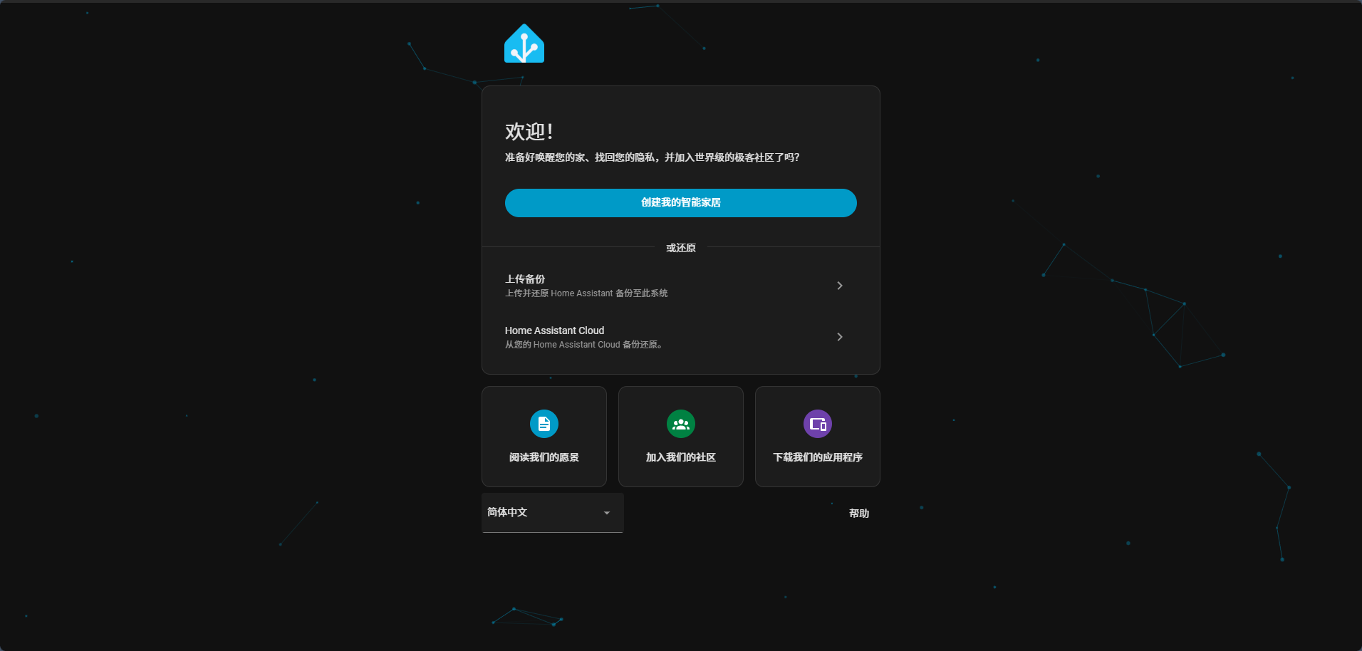 network_mode: bridge部署成功后,通过 IP + 22200 访问容器界面,语言选择“简体中文”,点击“创建我的智能家居”即可