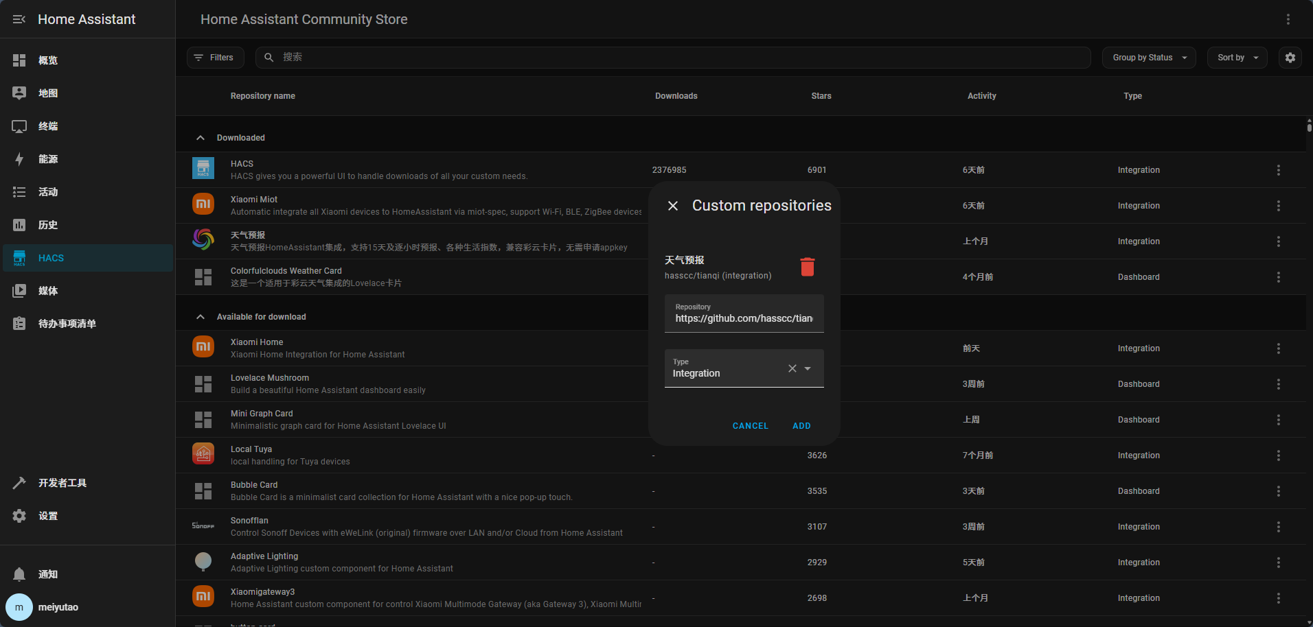 安装天气预报及彩云卡片,在 HACS 中添加自定义仓库: