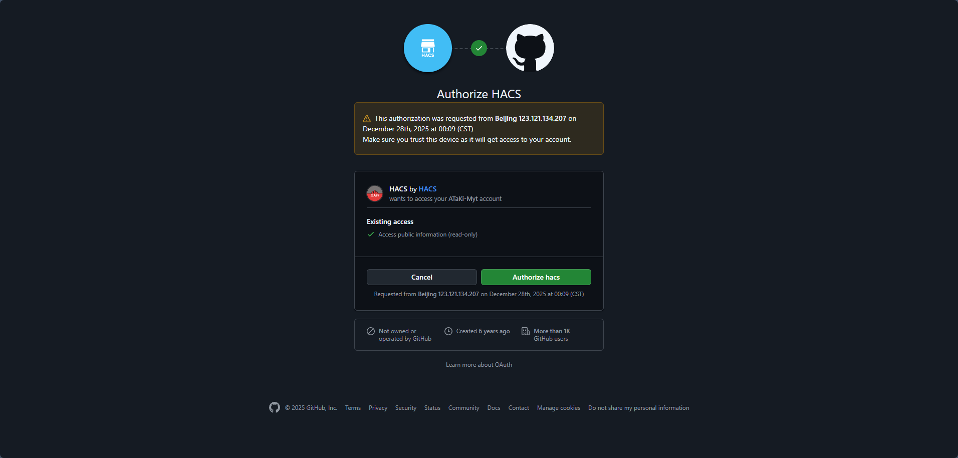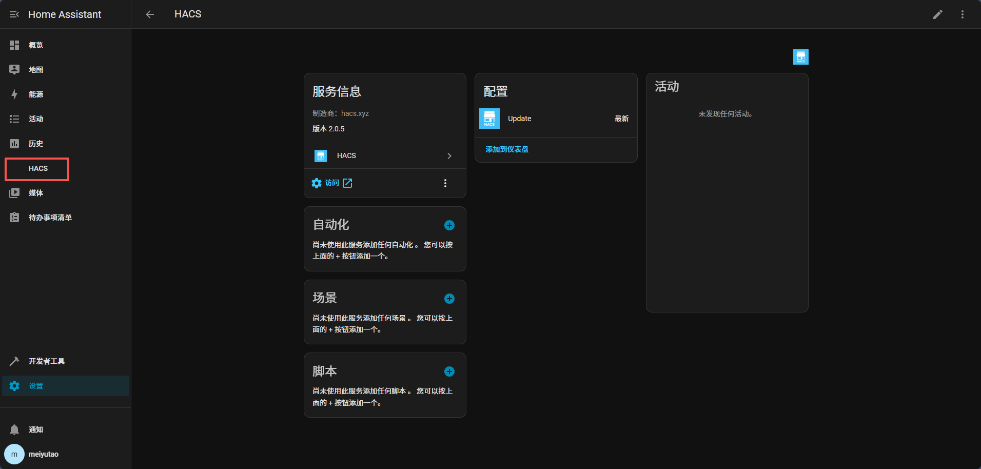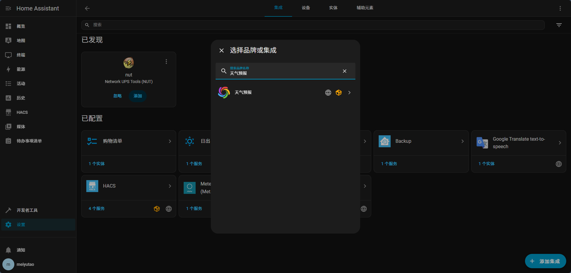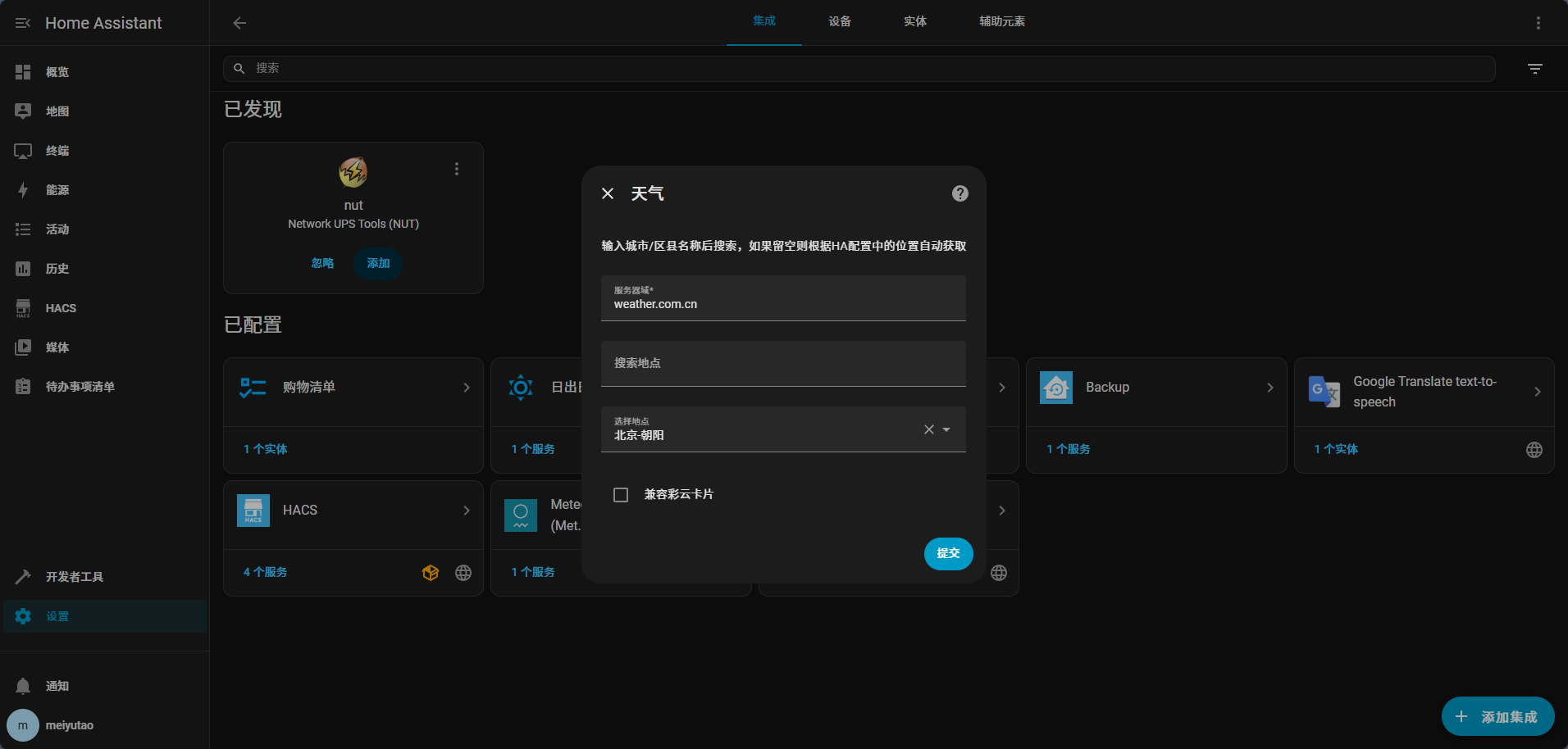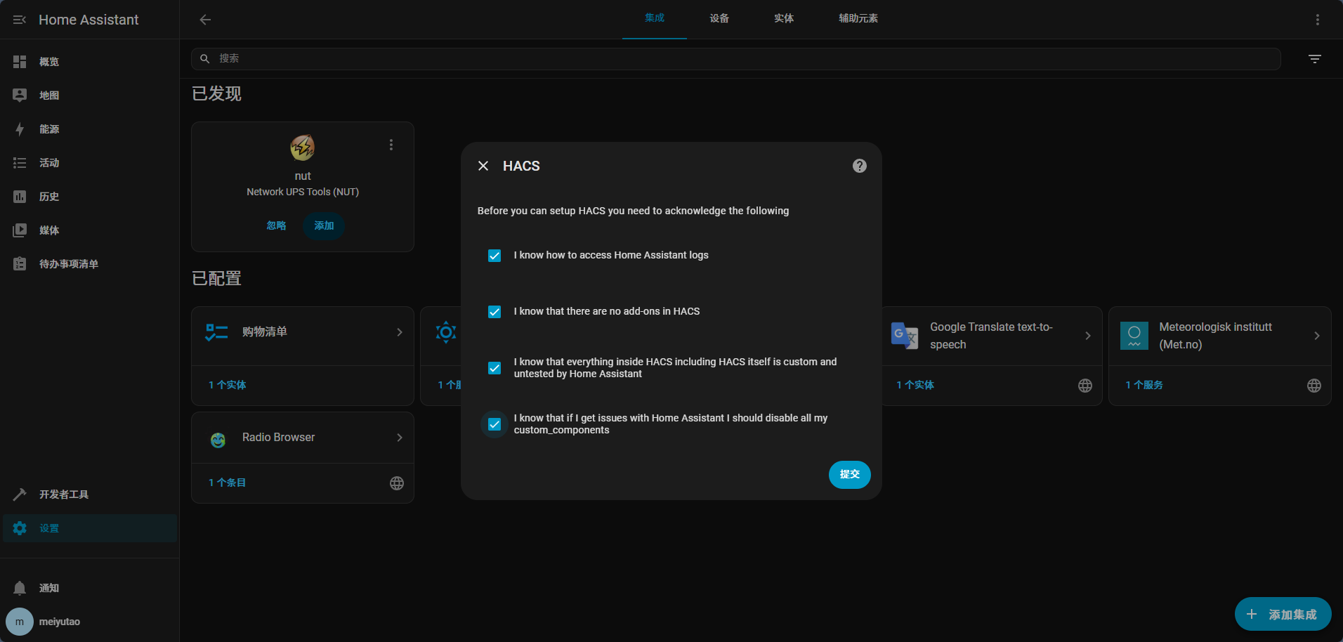 设置 —> 设备与服务 —> 添加集成 —> HACS —> 勾选必要项提交