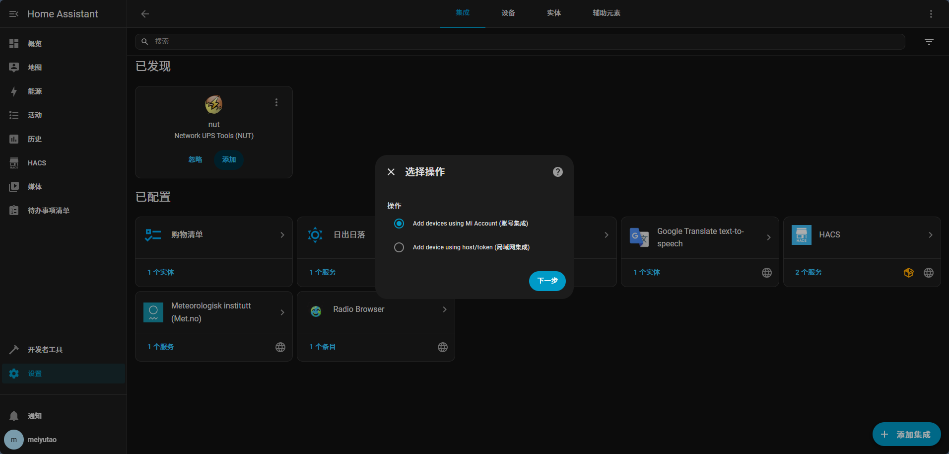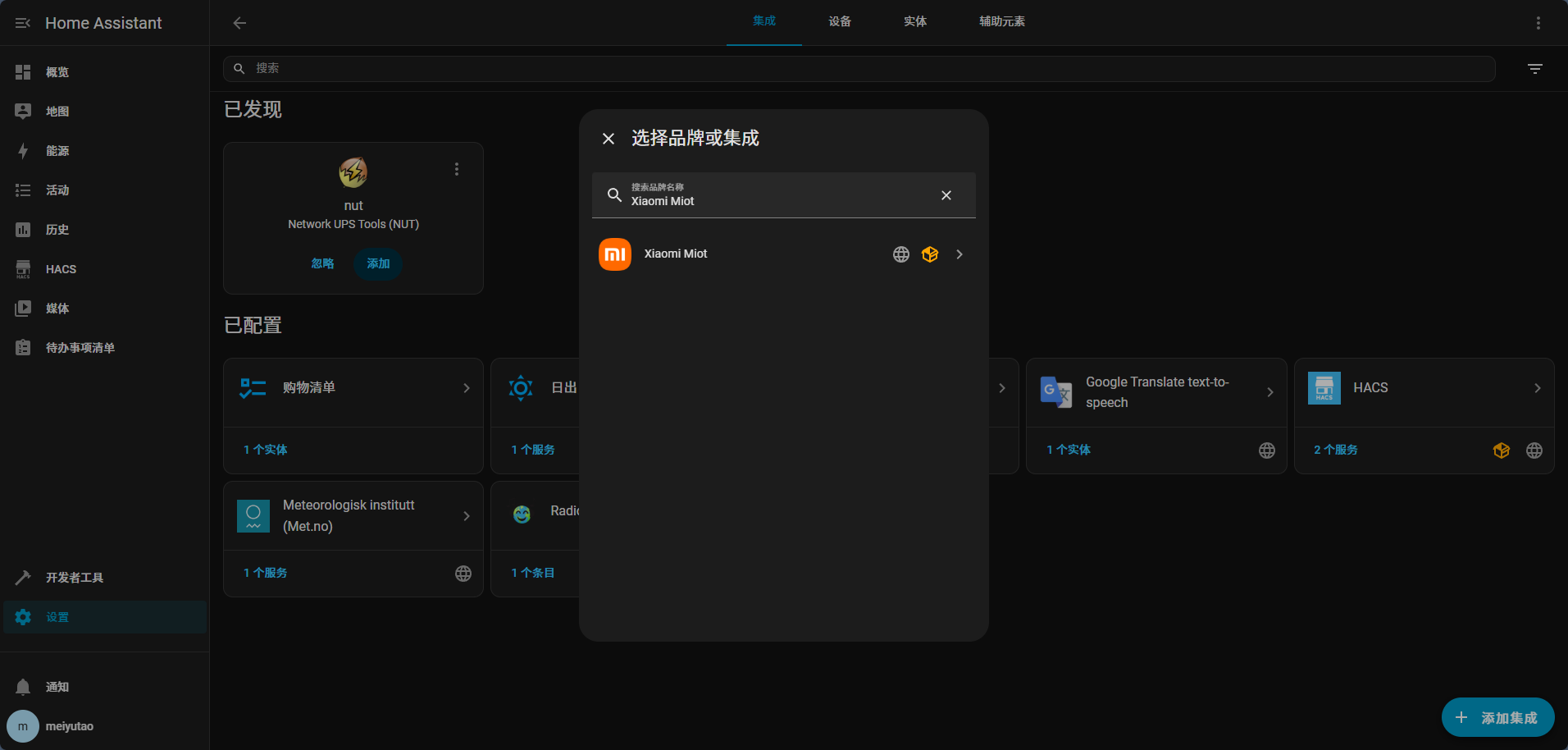 设置 —> 设备与服务 —> 添加集成 —> Xiaomi Miot