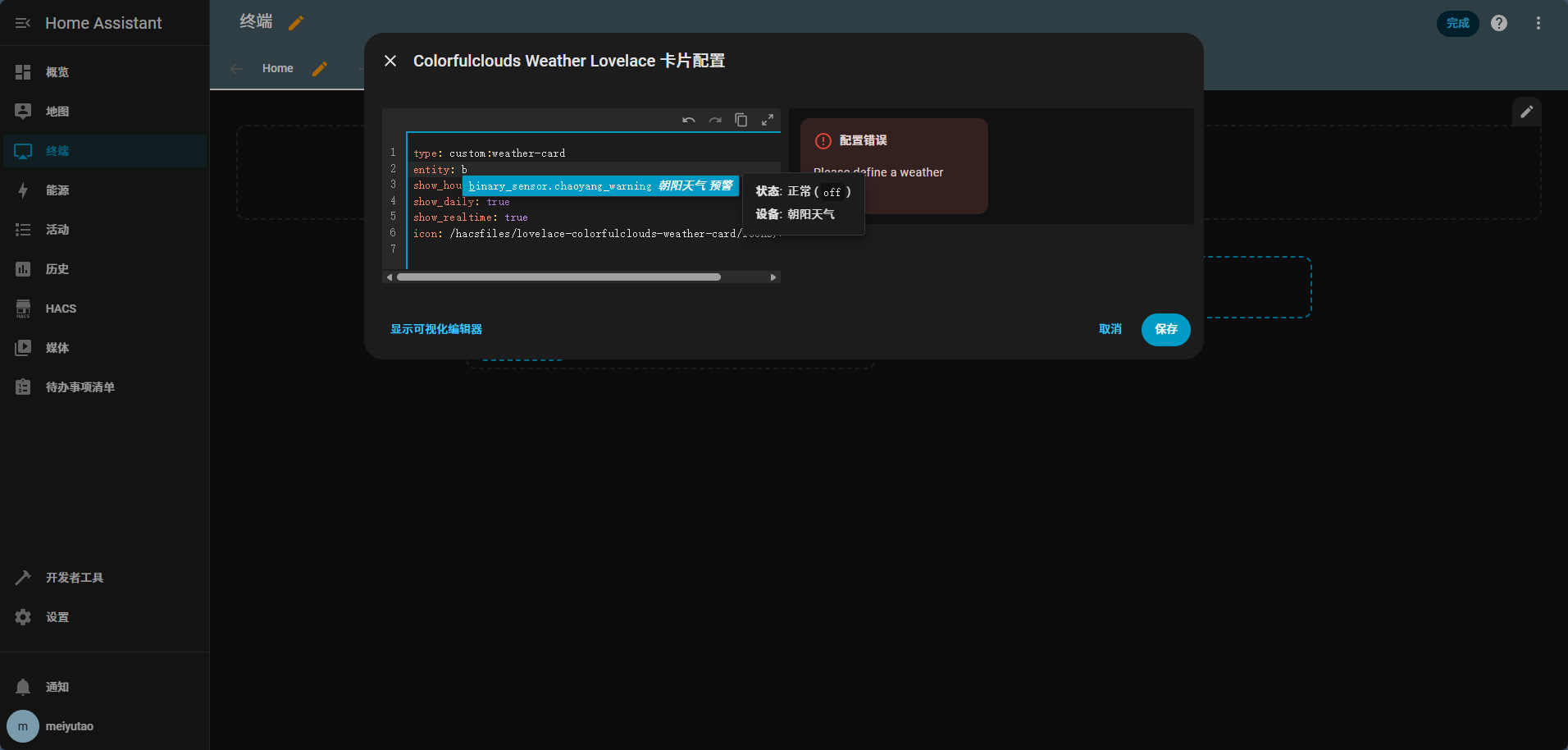 点击“显示代码编辑器”后,将“entity”项改为天气预报的实体即可配置卡片