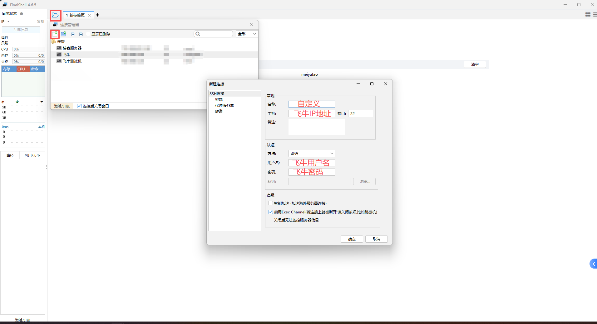 • 打开“FinalShell”软件,新建连接,输入 IP 地址、账号、密码