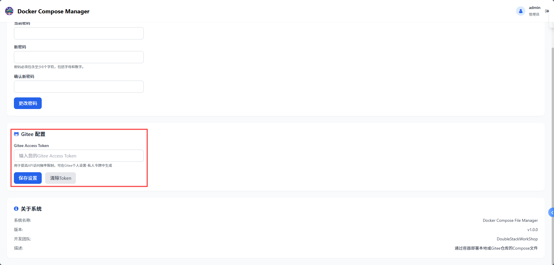 • 点击“系统设置”,跳转到系统设置界面,填入 Gitee 的令牌,点我获取令牌
